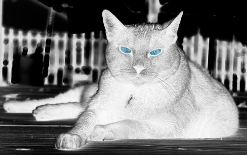 This piece of art started as a photo of our beloved cat Sabra, who passed away last fall after 17 years with us. She was a Russian blue – a silvery-grey breed. To give her a ghostly white appearance, we used Photoshop to convert the color photo to black-and-white. The color profile was inverted, making our dark cat light – almost white. Finally, we converted the black-and-white image back to RGB and used a digital paint brush with a moderate transparency in a shade of blue to re-color the eyes.