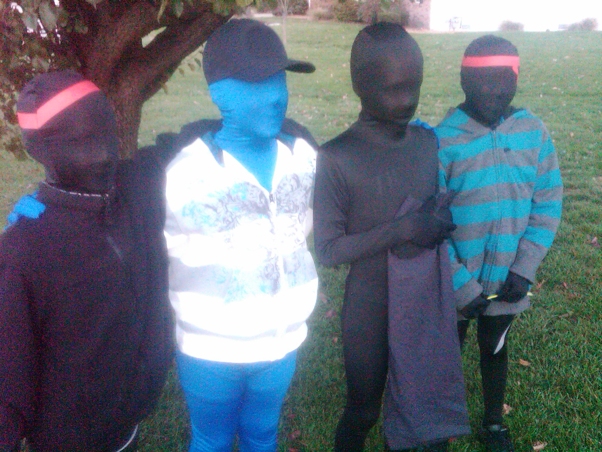 WICHITA FALLS, TX (PA NEWS,Oct. 31, 2012) — Four young town residents prepare to embark on their Halloween trick-or-treating adventure here. The four — and apparently all town residents under the age of 18 — are decked out in zentai bodysuits from Xeno Imports. The suits are an incredible fashion fad for this year’s Halloween season: they were virtually unknown six weeks ago, practically unattainable six days ago, and impossibly ubiquitous today. Though a clear mystery exists in the life cycle of the suits as this year’s “must have” costume, these boys are clearly happy — though their masked expressions belie it — to have the suits! (Photo by 3Bishops)